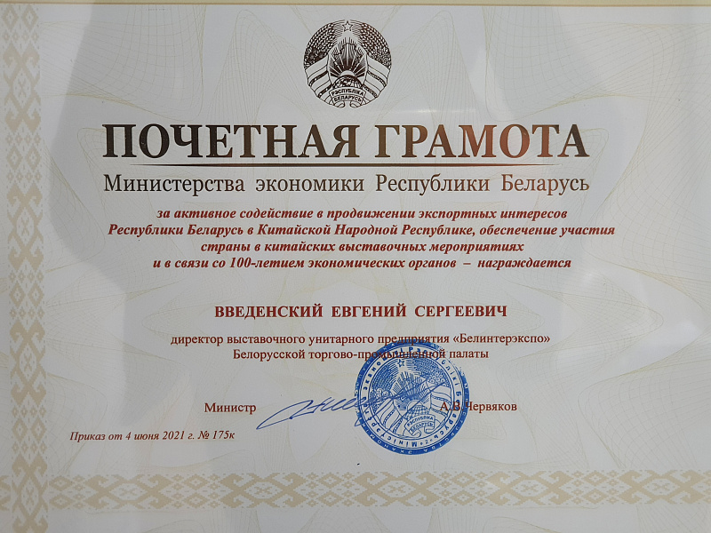 On July 26, 2021, Evgeny Vvedensky, Director of the exhibition company BELINTEREXPO of the Belarusian Chamber of Commerce and Industry, was awarded the Certificate of Honor of the Ministry of Economy of the Republic of Belarus "for active assistance in promoting the export interests of the Republic of Belarus in the People's Republic of China, ensuring the country's participation in Chinese exhibition events and with the 100th anniversary of economic bodies ”. The award was presented personally by the Deputy Minister of Economy of the Republic of Belarus Anzhelika Nikitina.