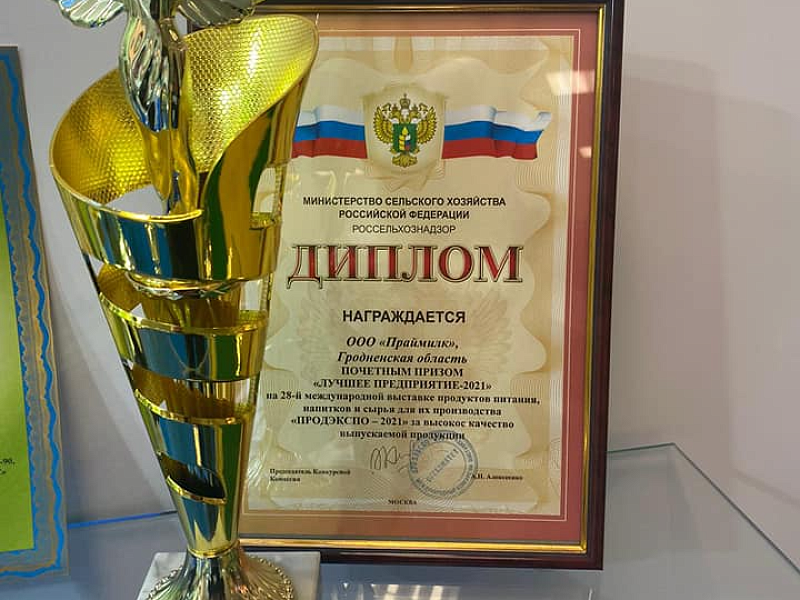 The Belarusian company "Primemilk", the largest producer of ingredients based on milk whey in Eastern Europe, won the title of "Best Enterprise 2021" at Prodexpo and received a silver medal and a gold star for the high quality of its products. The director of the enterprise Anatoly Belyavsky was also awarded personal honorary diplomas.
